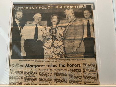 Queensland Police motto ‘With honour we serve’ was created by Margaret after a run-in with the law via a competition to come up with an inspirational tagline in 1993. It is still in use today. (See recently published news article)